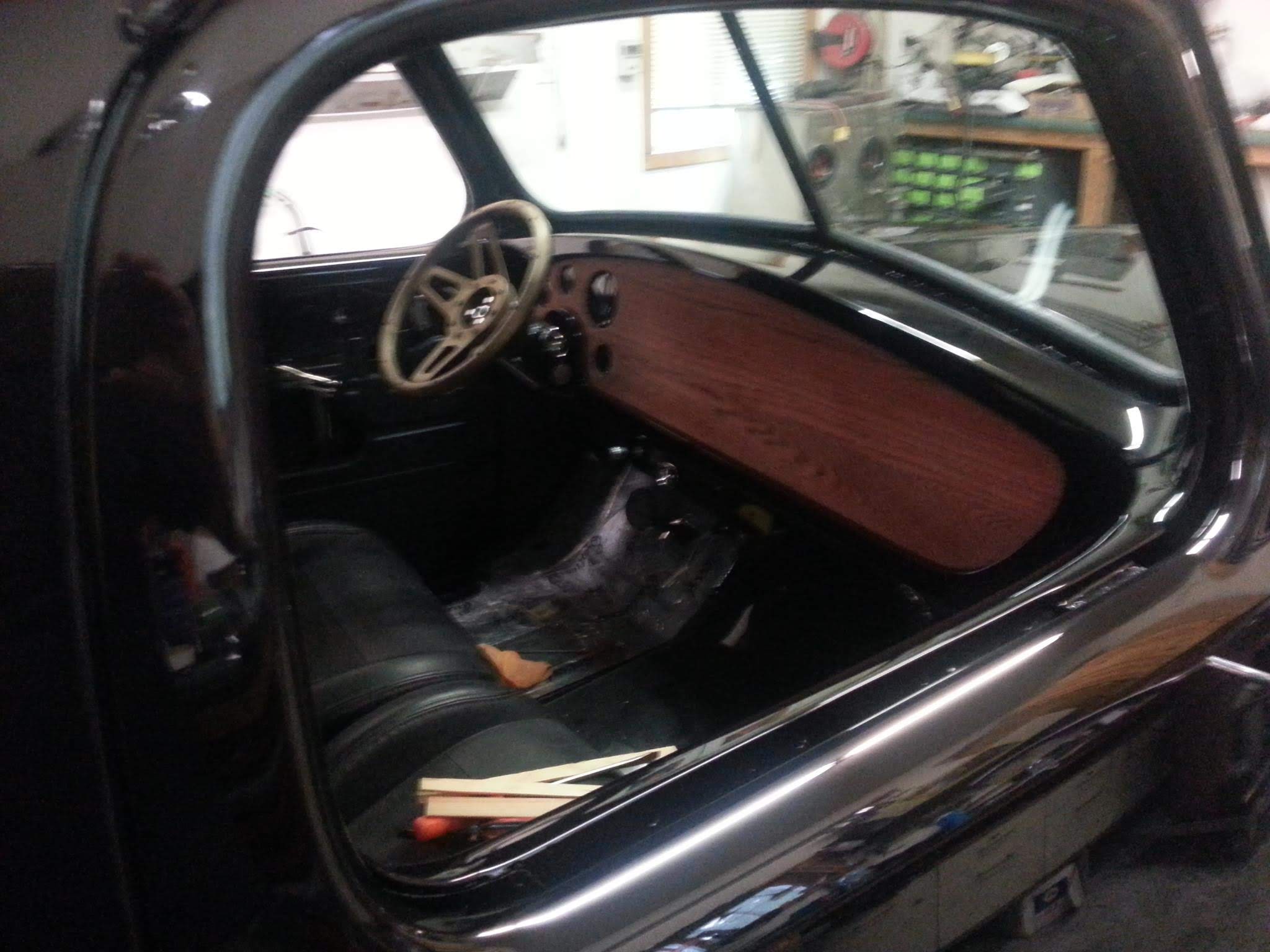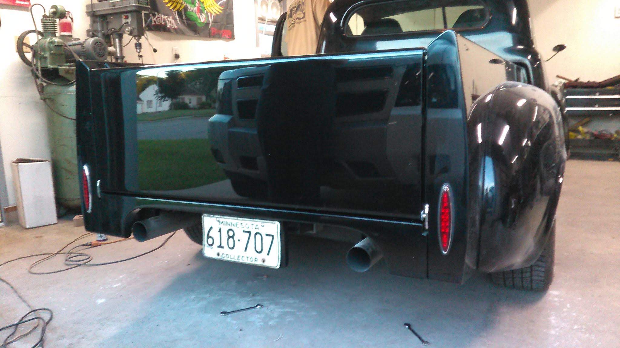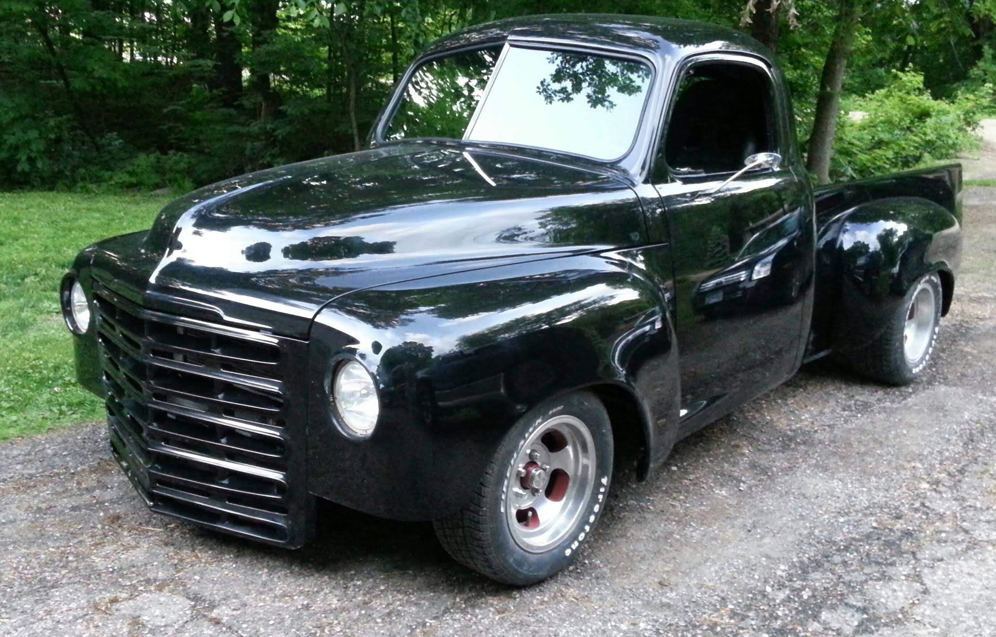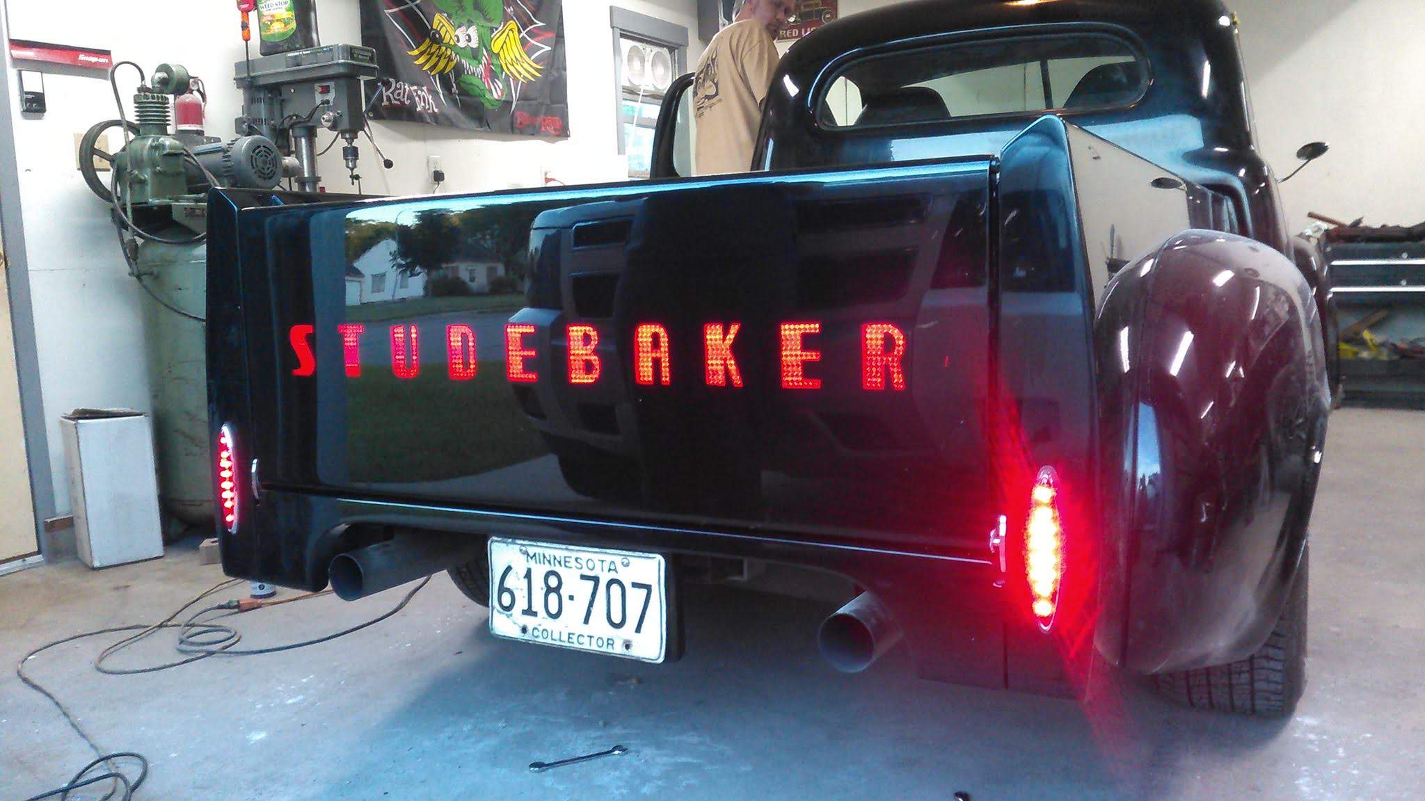 Body drop, frenched headlamps, and a custom dash are a few body modifications on this piece of art. The door handles are the side mirrors as well. The third brake light shines through the painted Studebaker script on the tailgate.